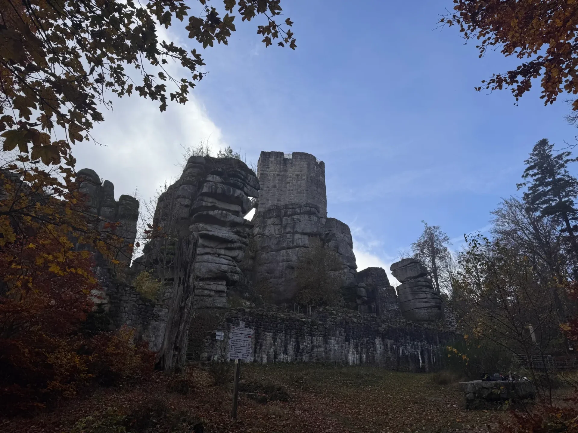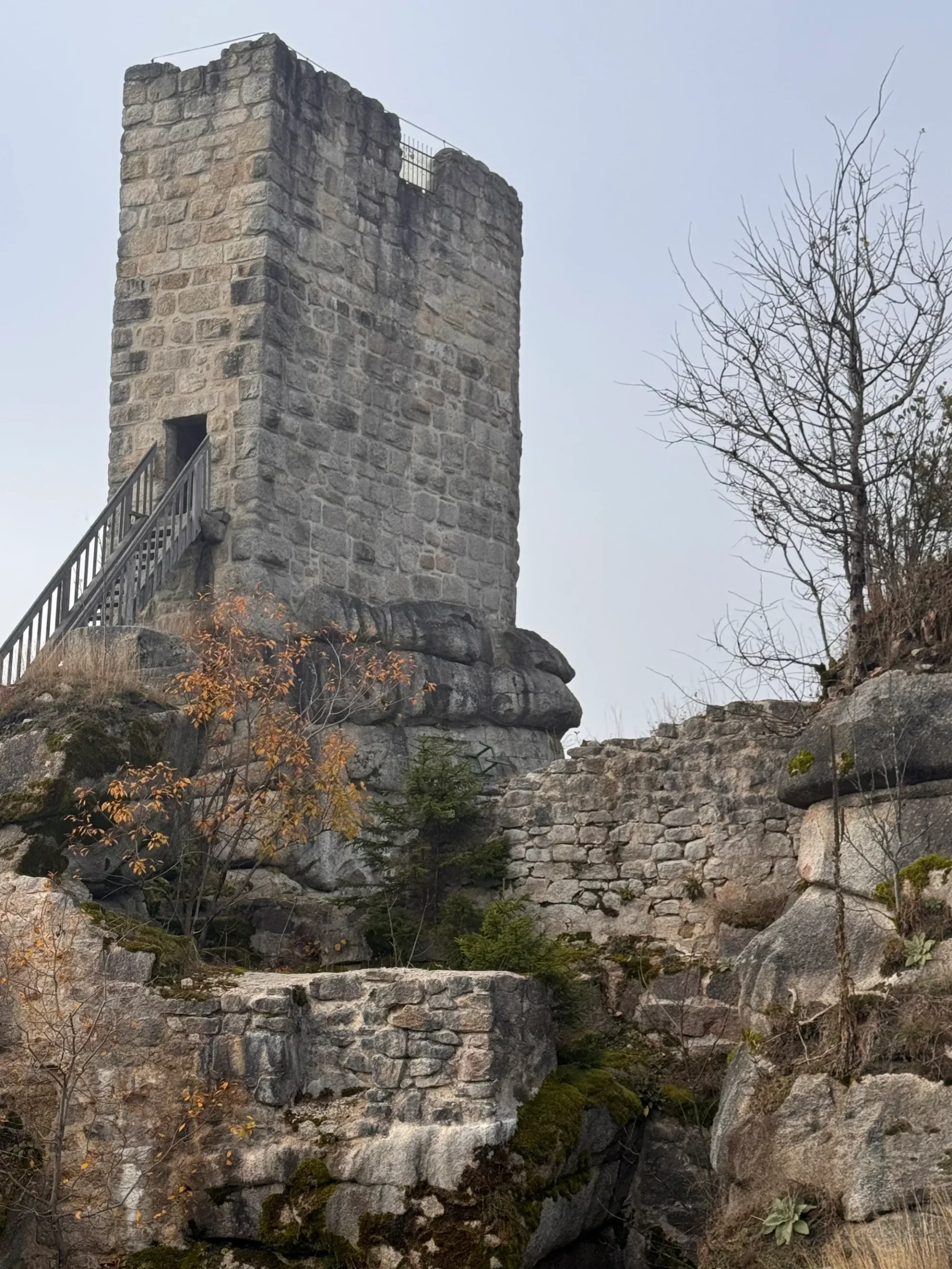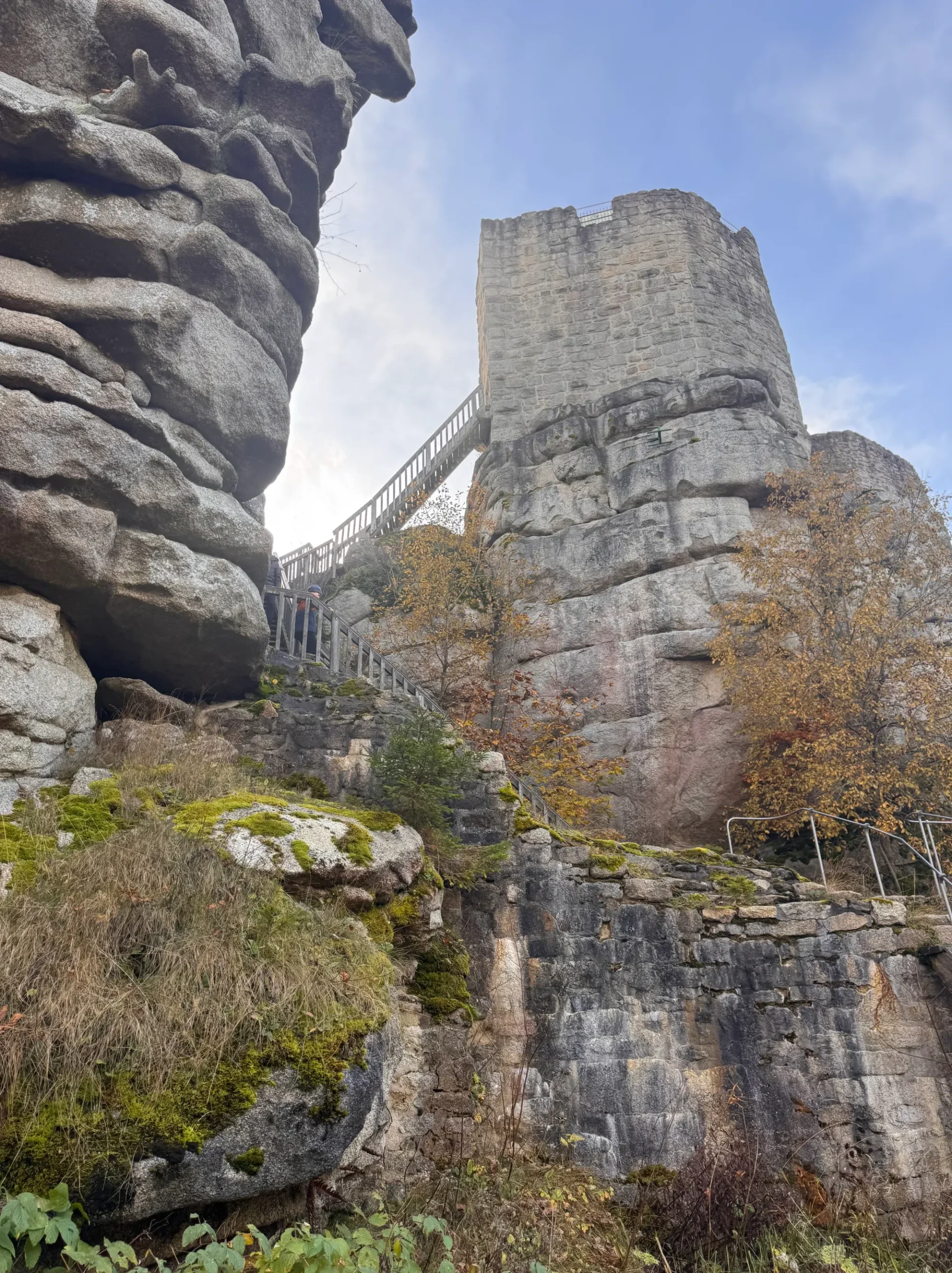Die Ruine ist wirklich beindruckend. Nicht, weil sie so groß oder imposant ist. Mich hat die Bauweise beeindruckt, da die eigentliche Burg perfekt in die vorhandene Felslandschaft eingefügt wurde. Vom Turm aus (Himmel, haben mir die Beine gebrannt oben) hat man vermutlich einen echt tollen Ausblick – mit Nebel eher nicht. Schön war es trotzdem und wir wurden oben auch mit ein bisschen Sonne belohnt!