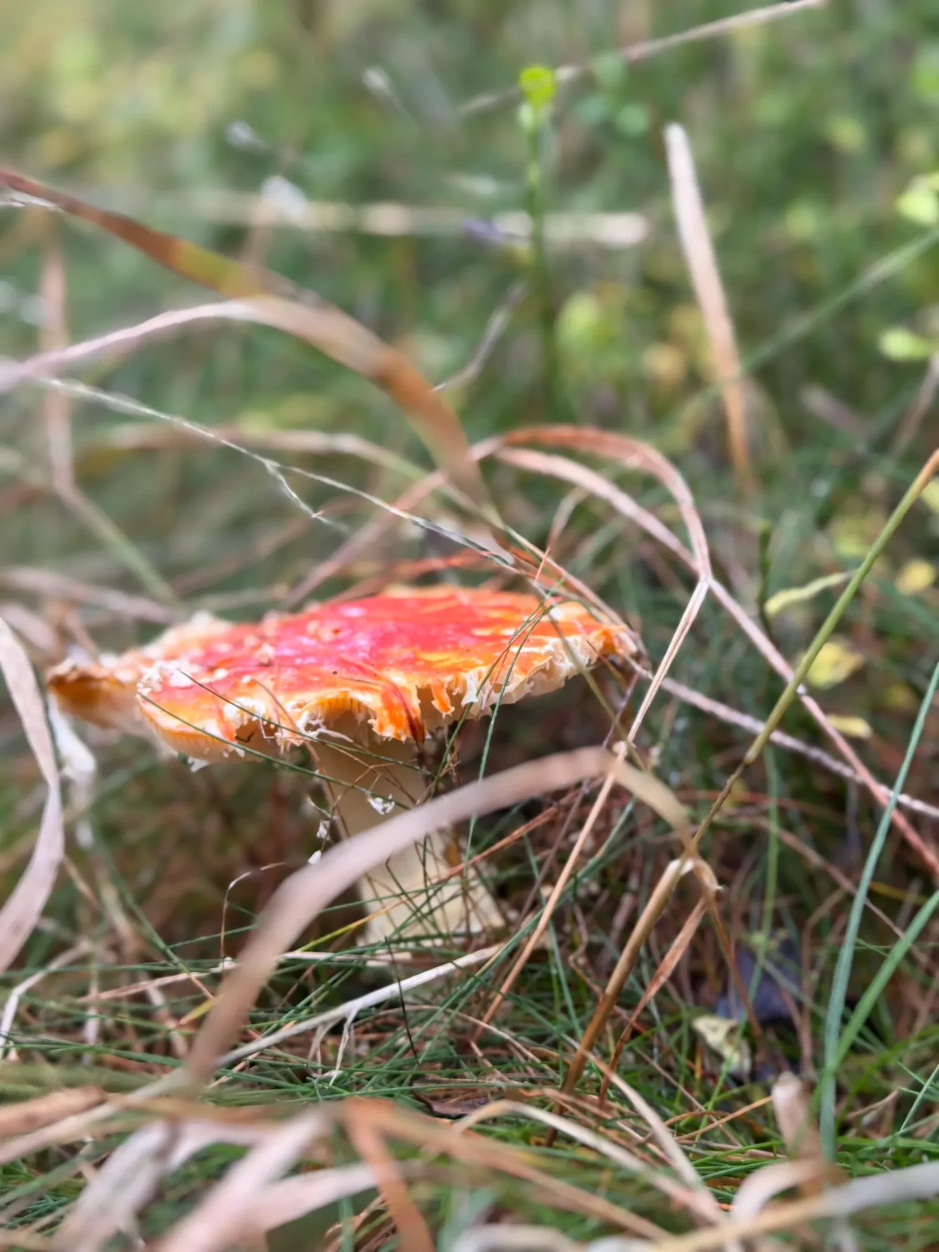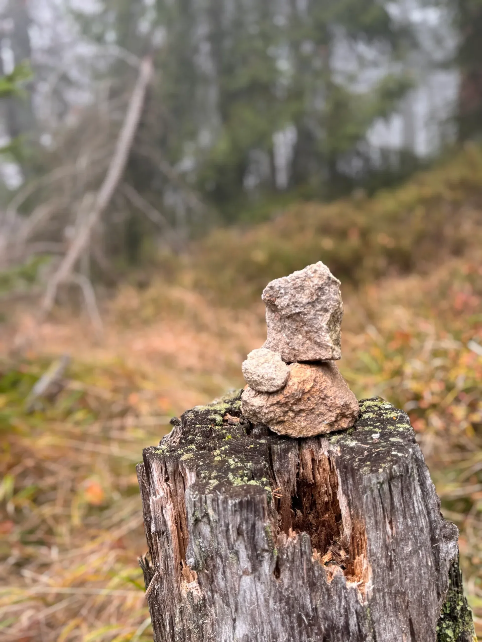 Nach einigen weiteren gestapelten Steintürmchen sind wir am „Pilzhaus“ angekommen. Im Prinzip ist es nur eine überdachte Rastmöglichkeit, aber das Dach ist komplett mit Gras und stellenweise eben auch Pilzen bewachsen. Und wenn sich eine Rastmöglichkeit so schön anbietet, dann muss man sie natürlich auch nutzen.